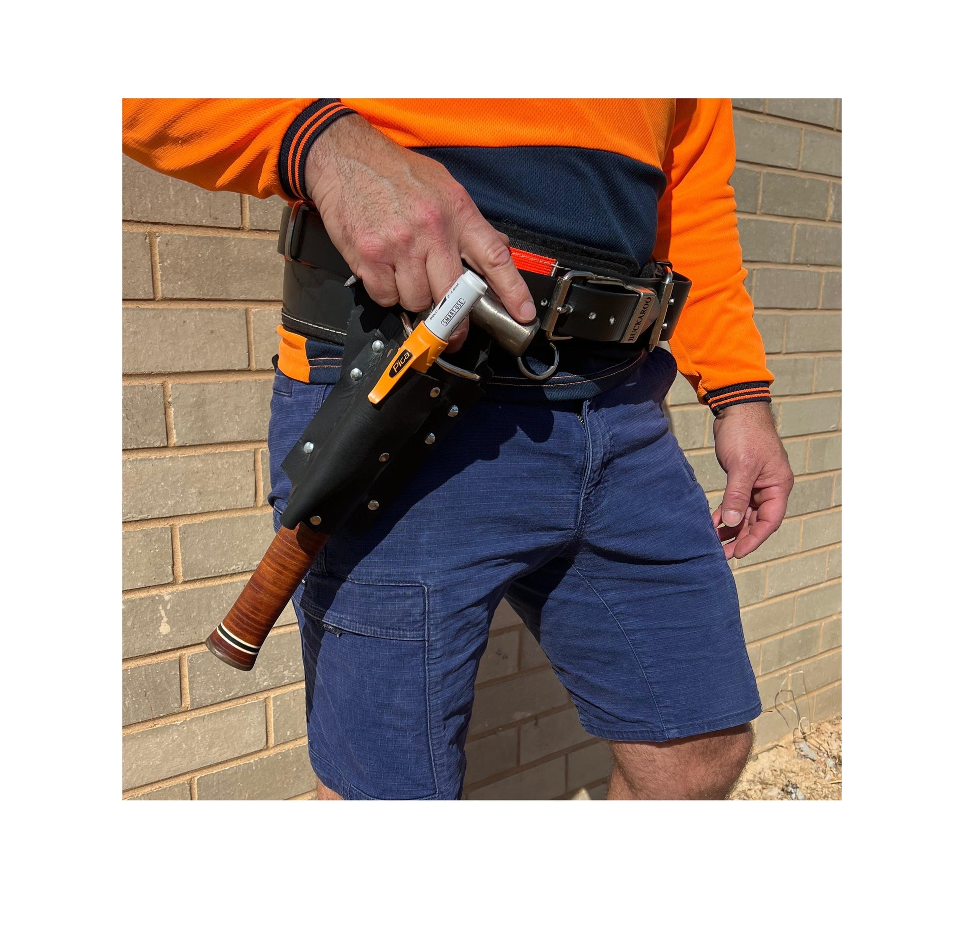 A Lighter but still Tough version of our Huckleberry Holster. This version has a Pica Pen Holder shown in the picture with an XL Pica (Pica Sleeve 25mm Diameter). Our Huckleberry holster has a tough design and is specially angled for comfort. D ring Size is 70mm x 50mm; Leather insert size 70mm x 47mm. Our Light ‘N’ Tough series is designed to last and be light, made of tough leather and strong zinc/aluminum rivets. Made by hand in our Australian workshop.
