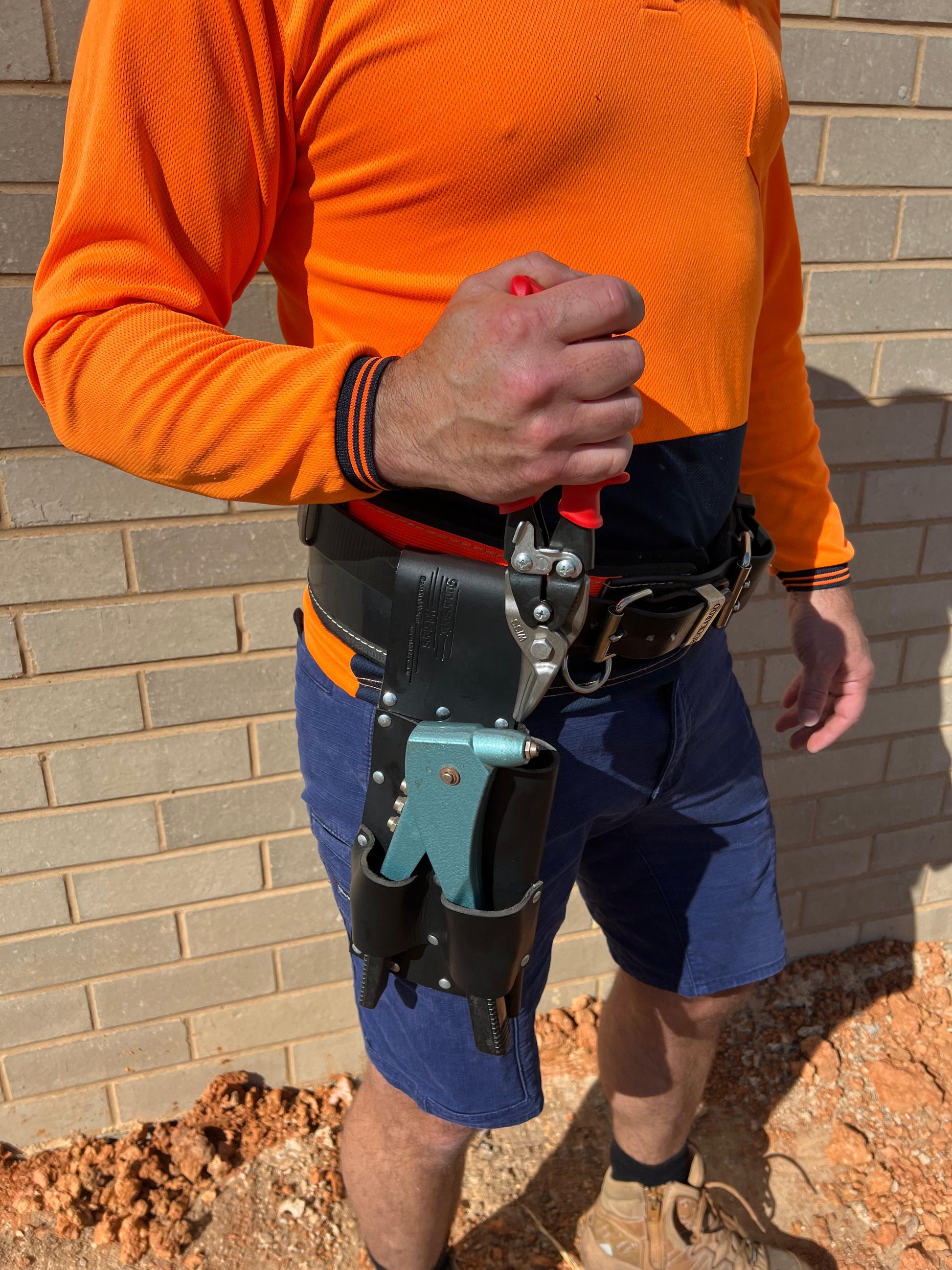 Our Light ‘n’ Tough holster is Great for Tin Snips & a Rivet gun. Our Light ‘N’ Tough series is designed to last and be light, made of tough leather and strong zinc/aluminum rivets. The Dimensions of the pockets are rear tin snipps pocket- 100mm x 190mm x 25-30mm (4 inch x 7.5 Inch x 1 Inch) (widest point). Front two pockets 2 x 25mm x 45mm x 70mm (1 Inch x 1.75 Inch x 2.75 Inch) Made by hand in our Australian workshop. Grab one Today!